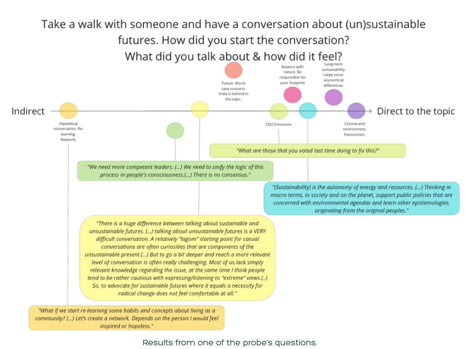 The (Un)sustainable futures probe triggered reflections, showing diverse perspectives on the future. It led to conversations about collective action, political engagement, and environmental responsibility.