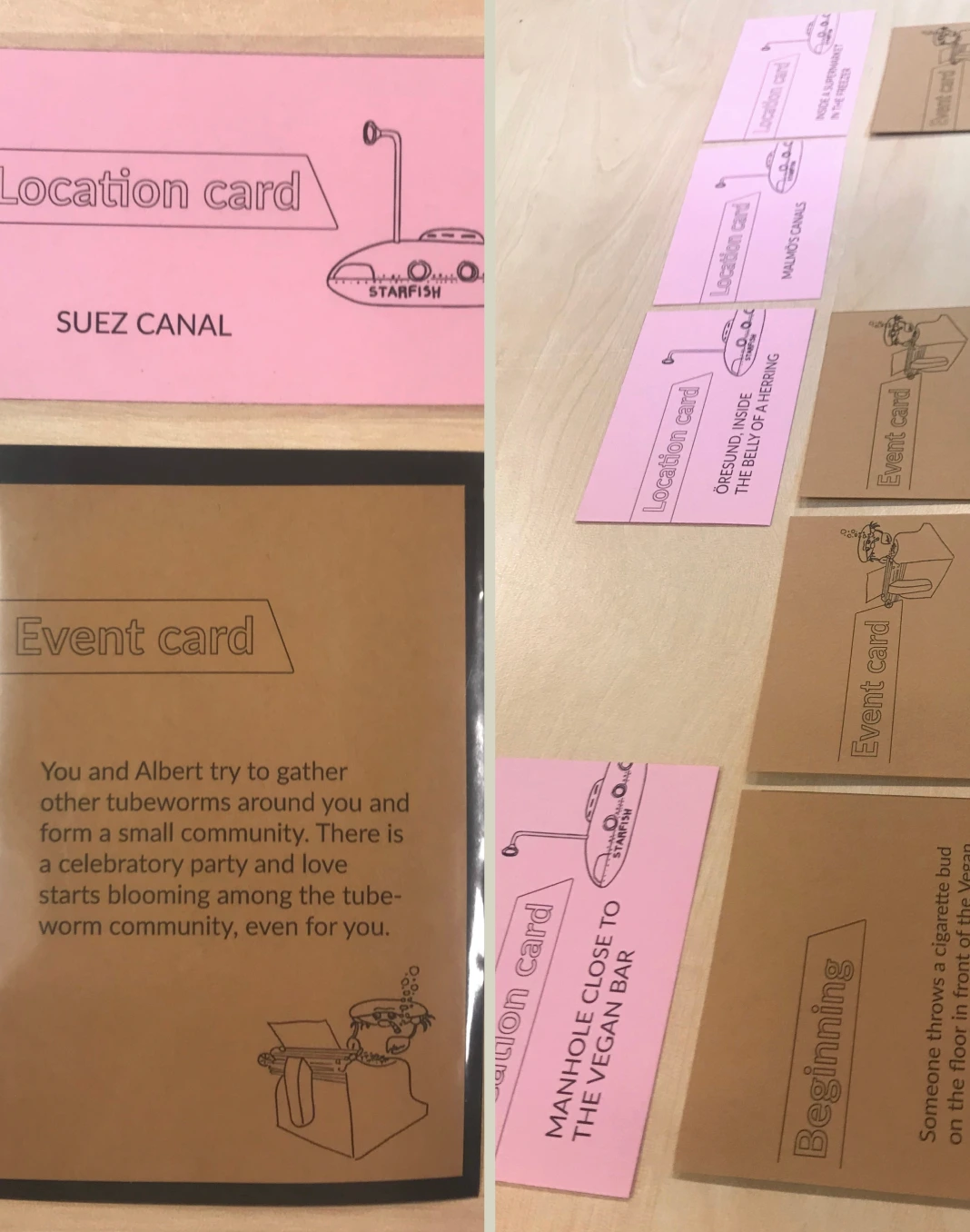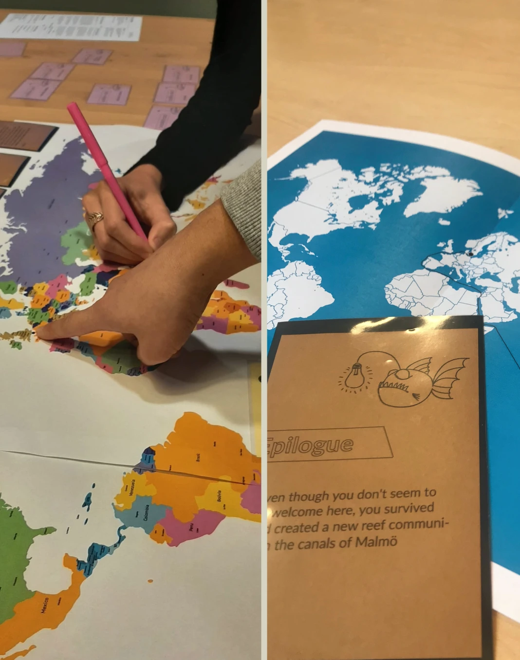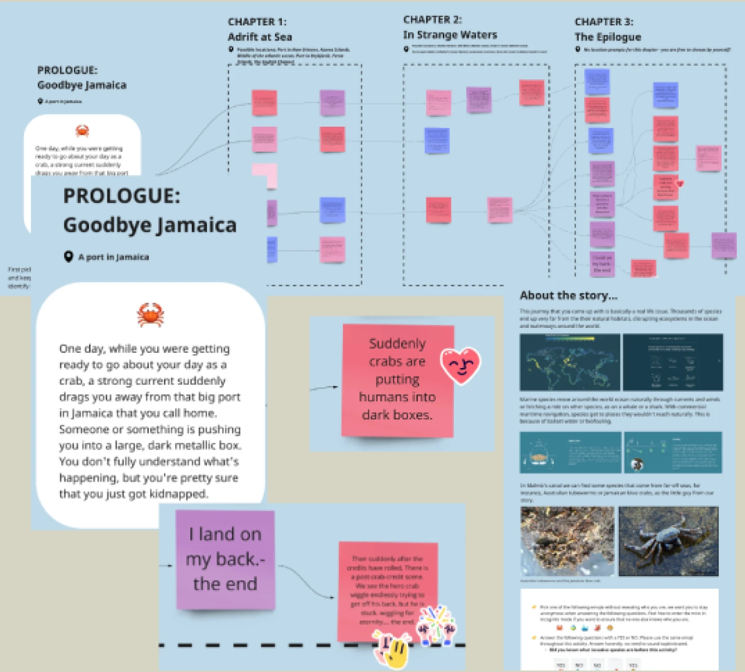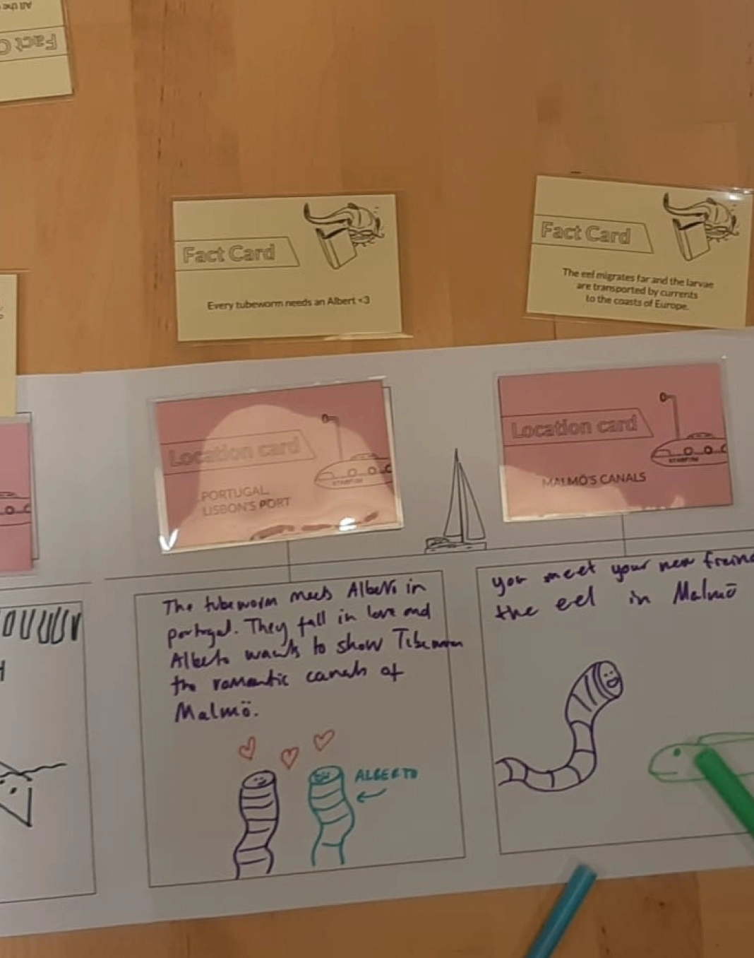 The Ocean Starts Here is a generative toolkit for storytelling in which we presented Malmö’s canals as a direct link to the ocean to spark conversations and generate reflections on local and global ocean issues. By creating a story departing from given beginnings and endings, or by collecting pieces of a story through answering ocean literacy questions, users get emotionally connected with the characters and the environmental issues, creating a deeper connection with the ocean.